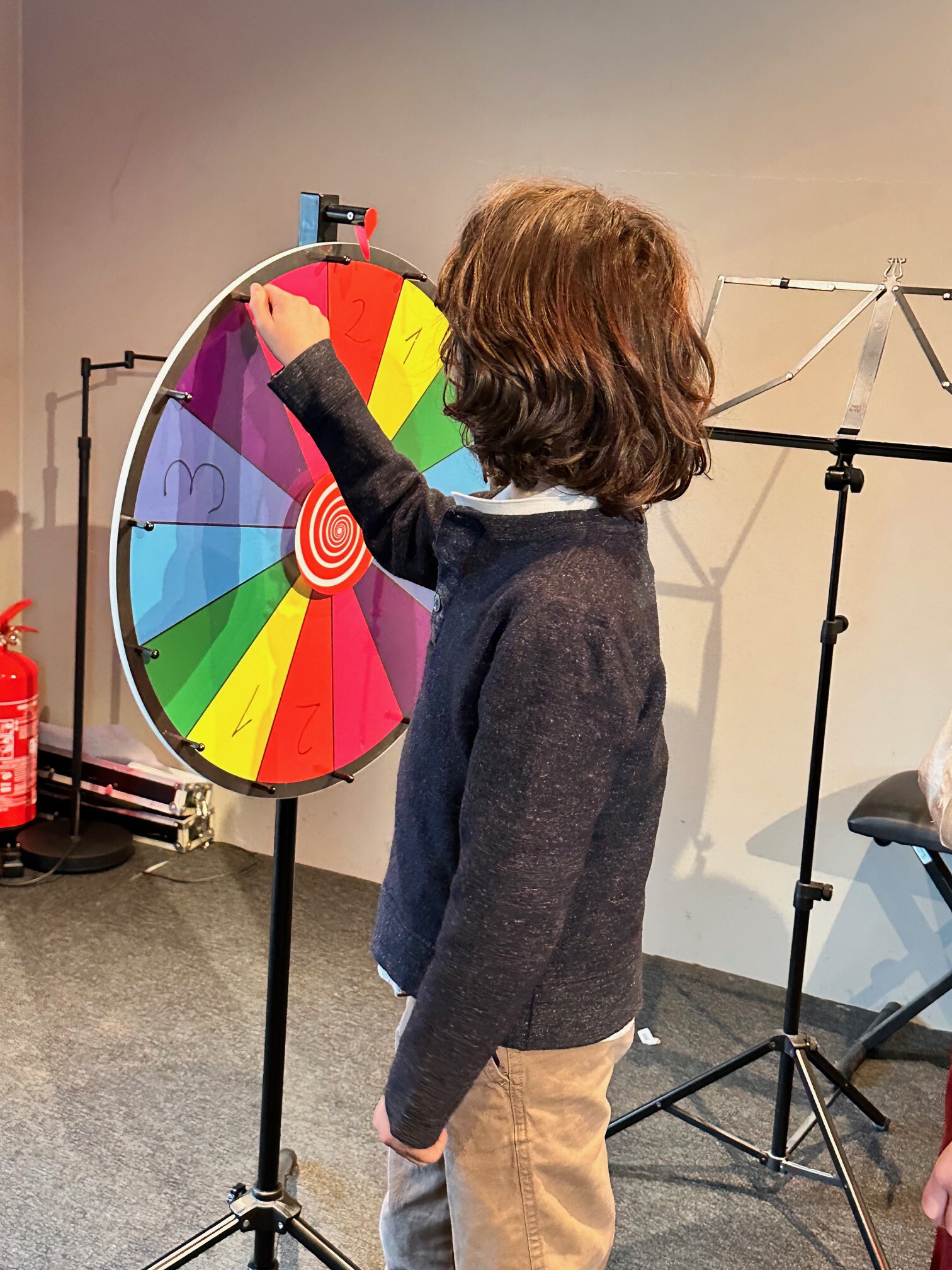 Hinterher: Fröhliches Glücksrad-Drehen mit schönen Geschenken aus dem Musik-Bereich zur Belohnung, verteilt in drei verschieden große Kisten zum Aussuchen.